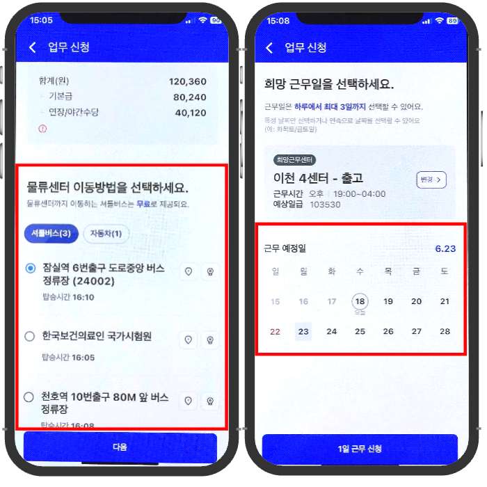 셔틀버스 탑승할 위치 선택 → 원하시는 근무일을 선택하면 '신청완료' 입니다.