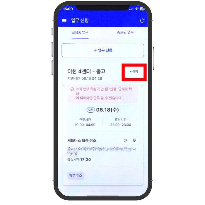 '신청'으로 보이는 부분이 '확정' 으로 변경되어야 근무할 수 있는거에요.