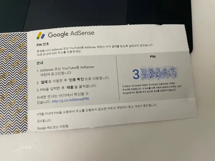 애드센스 pin번호가 담겨있는 우편물을 뜯어서 입력해보겠습니다.