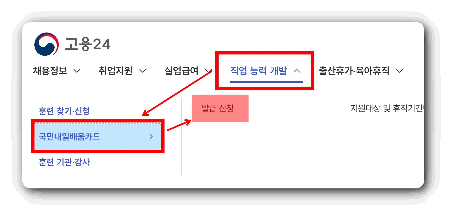 - [국민내일배움카드] → [발급 신청] 메뉴 선택