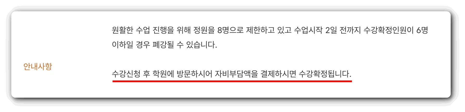 수강신청 후 에는 학원에 직접 전화해서 확인해보시는게 중요합니다. 마감여부가 실시간으로 표시되지 않을 수 있습니다.