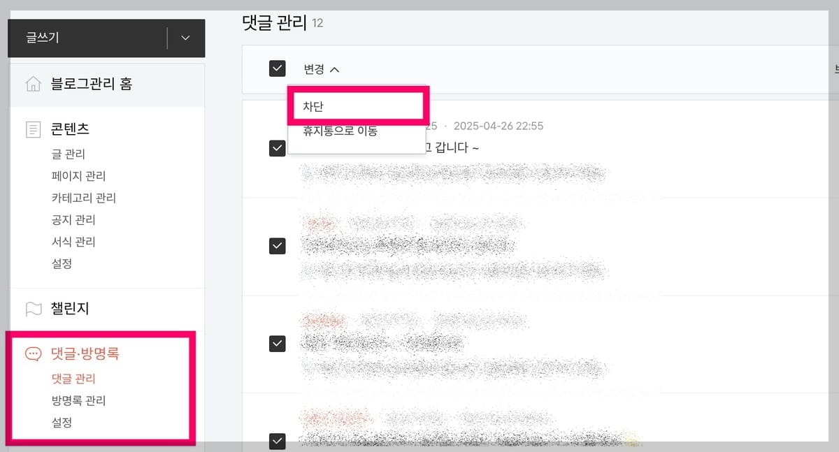 이미 내 블로그에 달린 스팸 댓글들이 보일거에요. 일괄 선택한 후 '차단' 을 눌러줍니다.