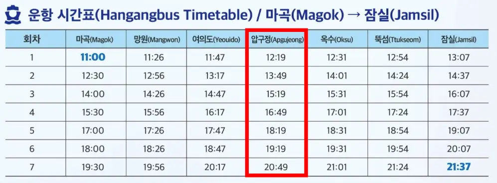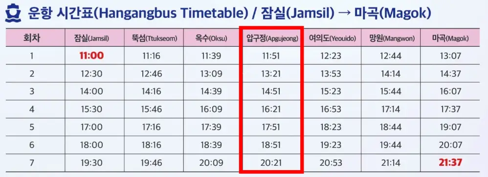 압구정에서는 마곡 방면/ 잠실방면 모두 탑승이 가능해요. 하루 7회씩 운행합니다.