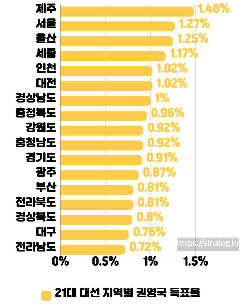 - 서울 1.27% — 시민사회·진보 단체 밀집, 소수 진보 후보 인지도 확보