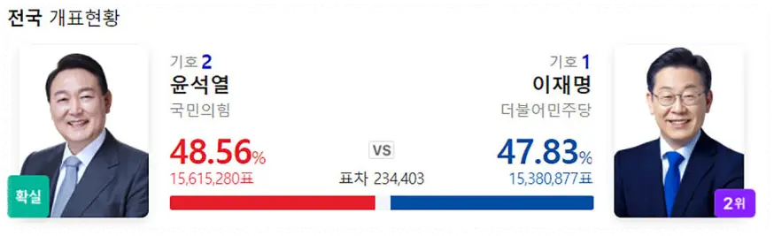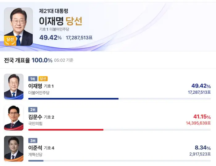 21대 대통령 선거에서 더불어민주당 이재명 후보가 49.42%의 득표로 대통령에 당선되었습니다. 하지만 많은 사람들이 예상했던 것보다는 좁은 격차였습니다.